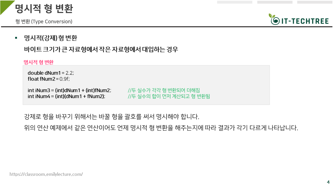 실수형 숫자의 연산 결과를 정수형으로 반환해야 하는 경우 교안의 예제처럼 명시적 형 변환이 필요할 수 있습니다.
