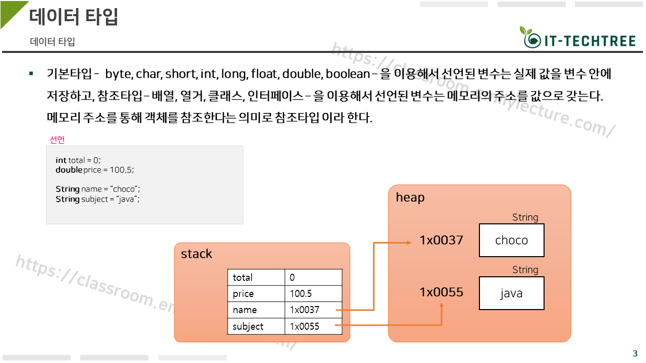 그림에서도 보면 일반 정수형이나 실수형으로 정의한 total과 price는 stack에 값이 담겨져 있고, String 객체로 선언된 변수 name과 subject는 heap에 값을 담고 담겨진 위치의 주소를 변수이름이 정의되어 있는 stack에 담는 것을 설명하고 있습니다.
