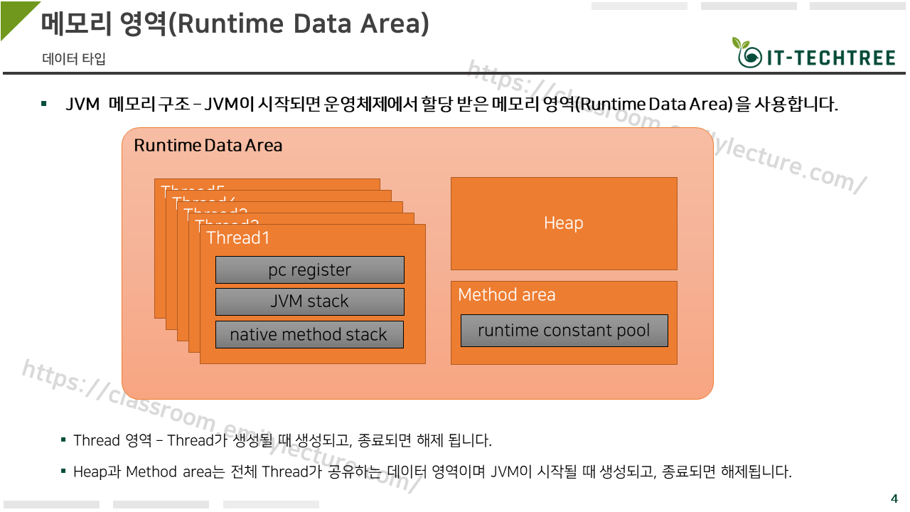 프로그램 실행 중 클래스가 사용되면, 클래스의 변수, 메소드 정보, static 변수, 메소드와 생성자의 바이트코드, 각 클래스, 인터페이스에 관련된 런타임 상수풀이 저장됩니다. - Threads