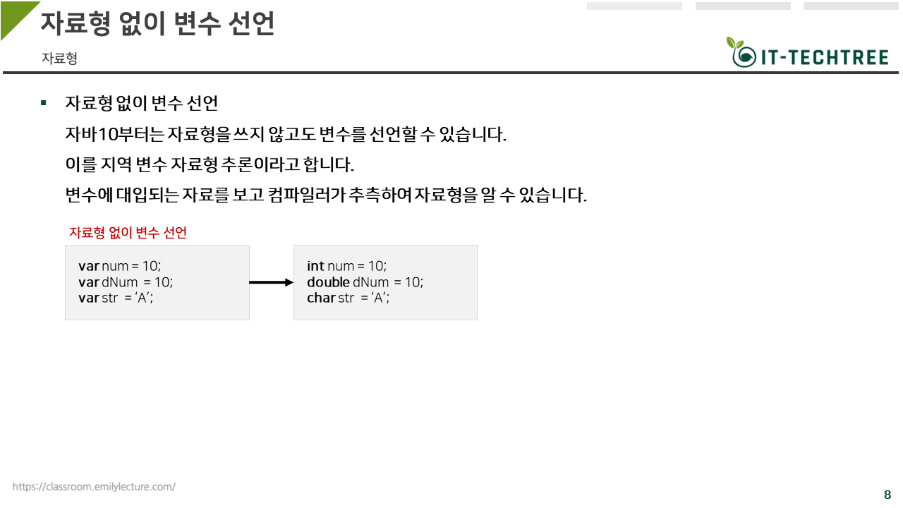 자바는 변수를 선언할 때 데이터 타입을 명시해야하고, 파이썬은 변수 선언할 때 데이터 타입을 명시하지 않아도 된다 였습니다. 하지만, 자바 버전 10부터는 자료형을 쓰지 않고도 변수 선언을 할 수 있습니다.