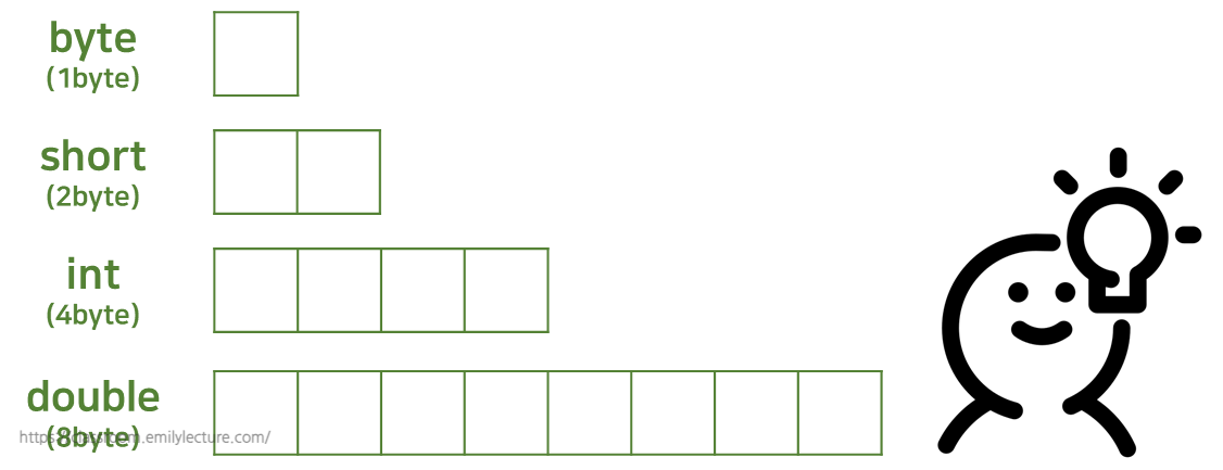 대신 이건 기억해두죠. byte는 한칸, short는 두칸, int는 4칸, double은 8칸의 공간을 준비해 두는 것이다. 라고.