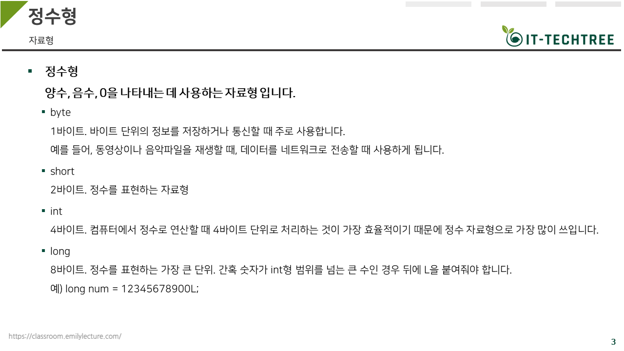 위 교안에 정리되어있는 내용은 자바가 기본적으로 제공하는 기본 자료형(원시자료형, Primitive type)의 종류입니다.